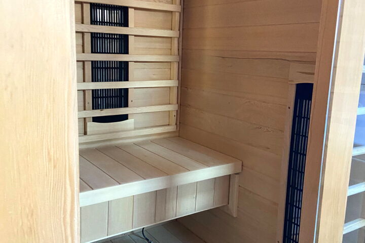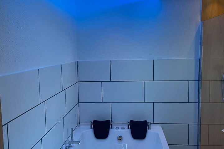 Verwöhn-Badezimmer Regendusche mit Blubberwand, Paarbadewanne sowie eine wärmende Infrarotkabine.